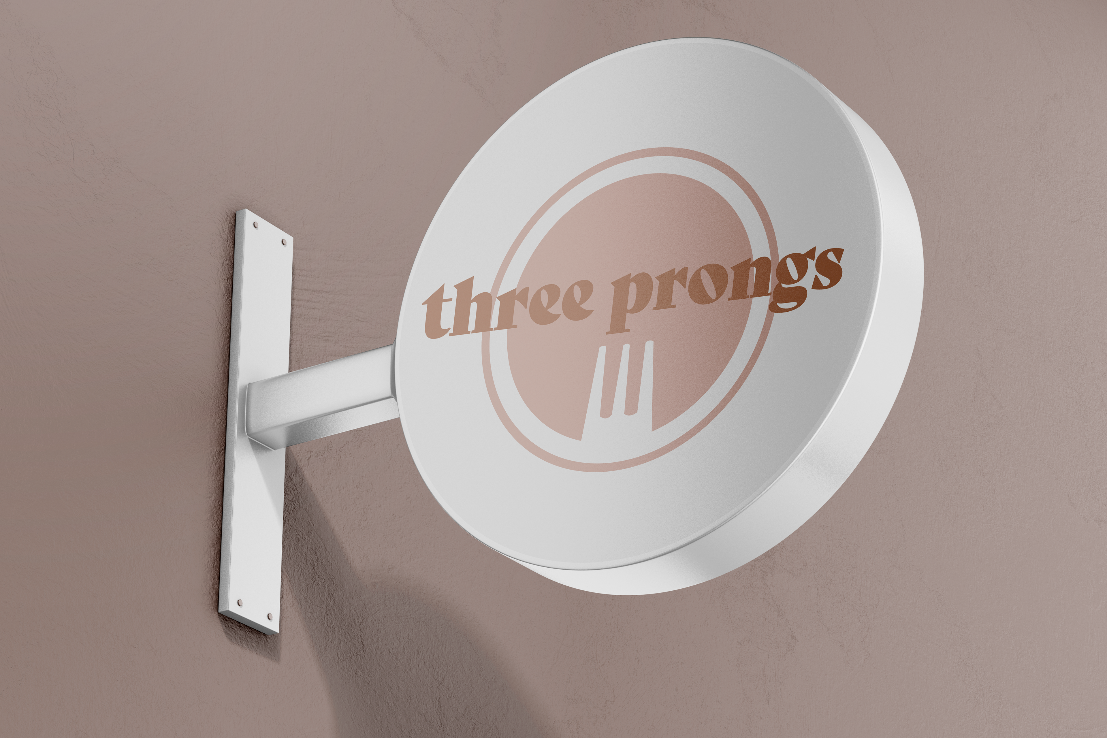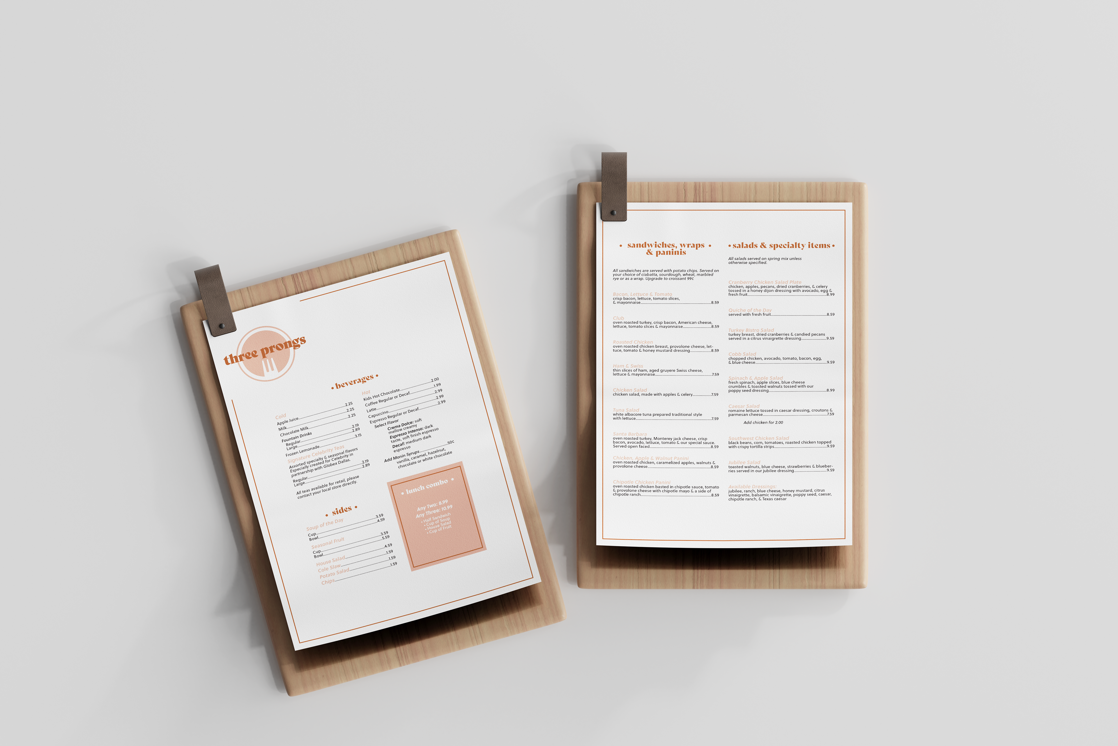Menu, logo, and identity design for a small restaurant called Three Prongs. A simplistic but communicative logo and cohesive color scheme are the key components of this project and demonstrate crisp and clean work.